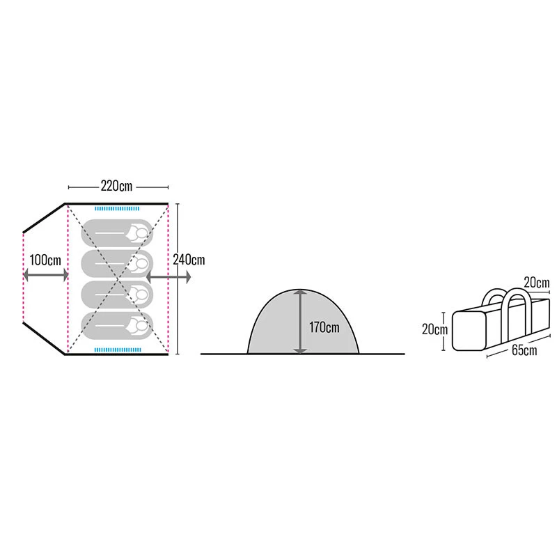 - Σκηνή κάμπινγκ 4 ατόμων HUPA με μονό πανί, δύο μεγάλες εισόδους και μεγάλα τετράγωνα πλαϊνά παράθυρα με σίτα και εξωτερικό τεντάκι.