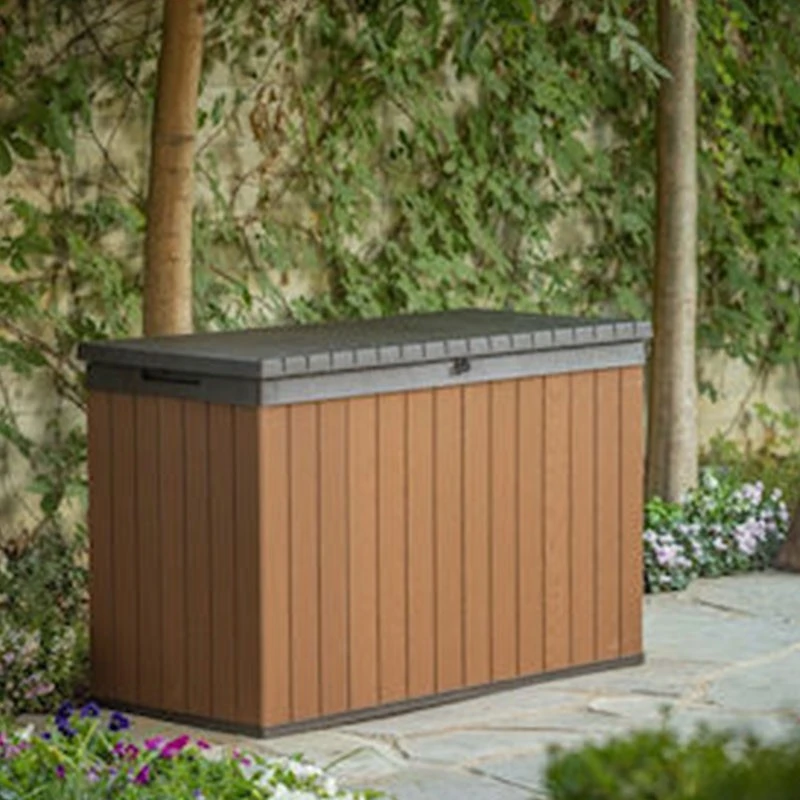- Με το ξύλινο ύφος του και το βιομηχανικό του στιλ, αποτελεί μια εξαιρετική προσθήκη στον κήπο σας. Το μπαούλο αποθήκευσης Darwin για εξωτερικούς χώρους , ιδανικό ακόμη και για μαξιλάρια σαλονιού ή αξεσουάρ πισίνας. Το καπάκι είναι εξοπλισμένο με βολικούς ανυψωτήρες αερίου για εύκολο και ασφαλές άνοιγμα και κλείσιμο. Χάρη στην αδιάβροχη κατασκευή του, αντέχει στον ήλιο και τη βροχή και διατηρεί τα πράγματά σας στεγνά και αεριζόμενα. Επιπλέον, το μπαούλο αποθήκευσης κήπου μπορεί να κλειδωθεί (το λουκέτο δεν περιλαμβάνεται).