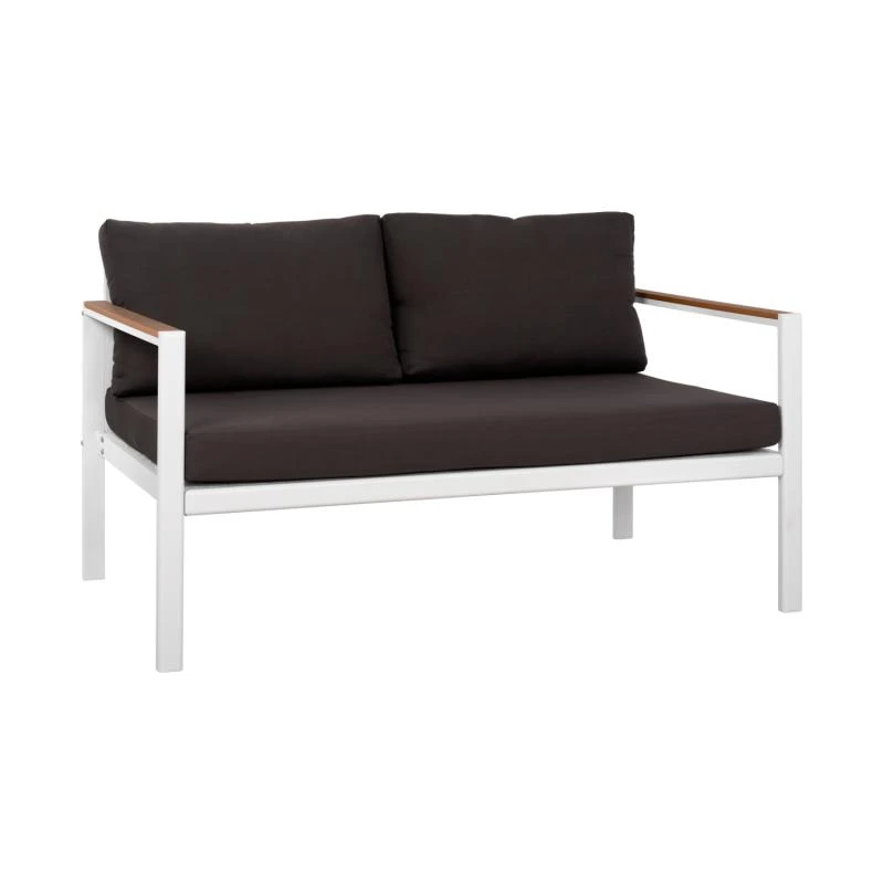 Καναπές διθέσιος με σκελετό αλουμινίου σε λευκή απόχρωση, λεπτομέρειες polywood στα μπράτσα και υφασμάτινα μαξιλάρια σε σκούρο γκρι χρώμα.
