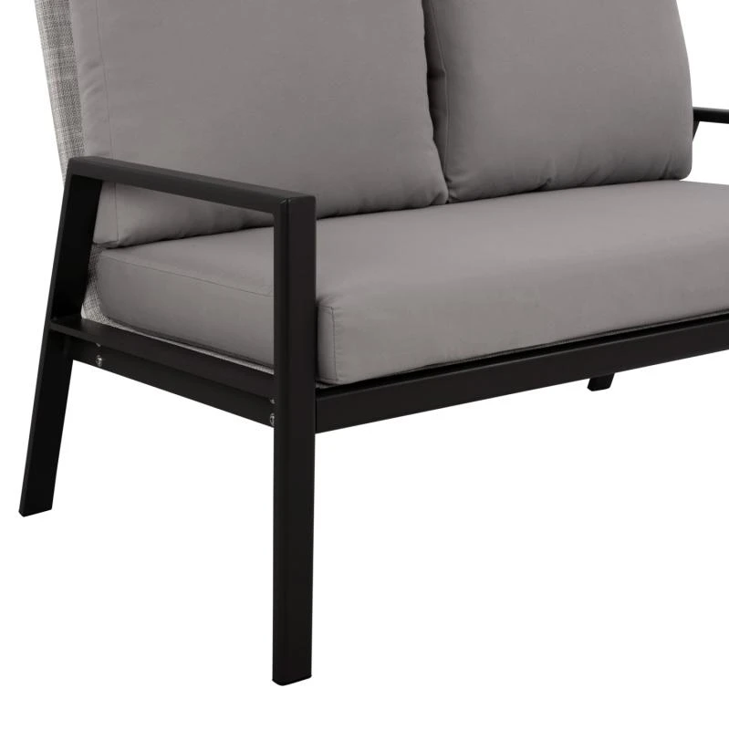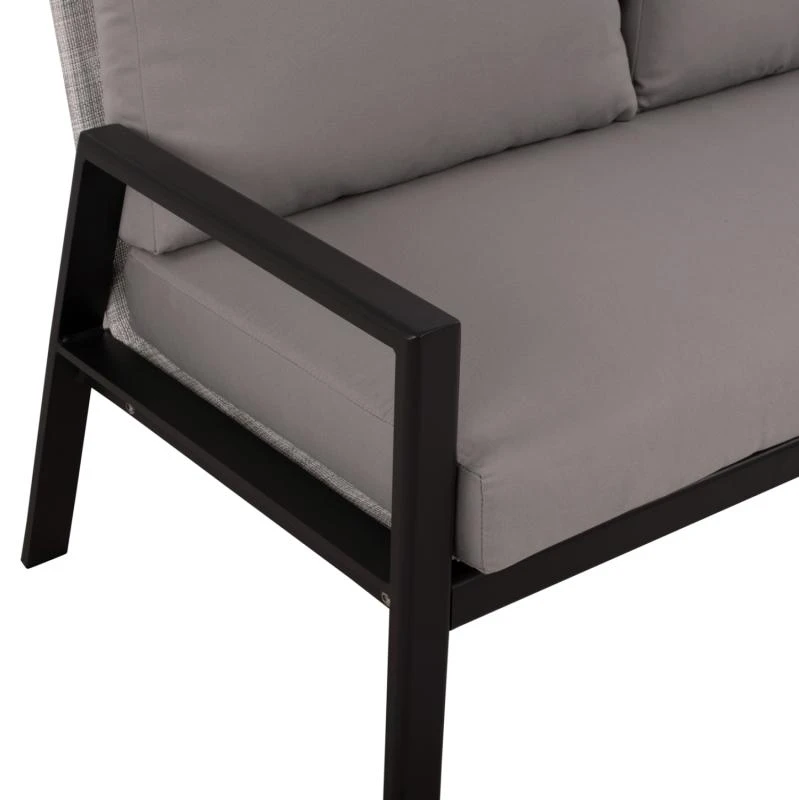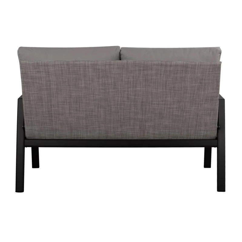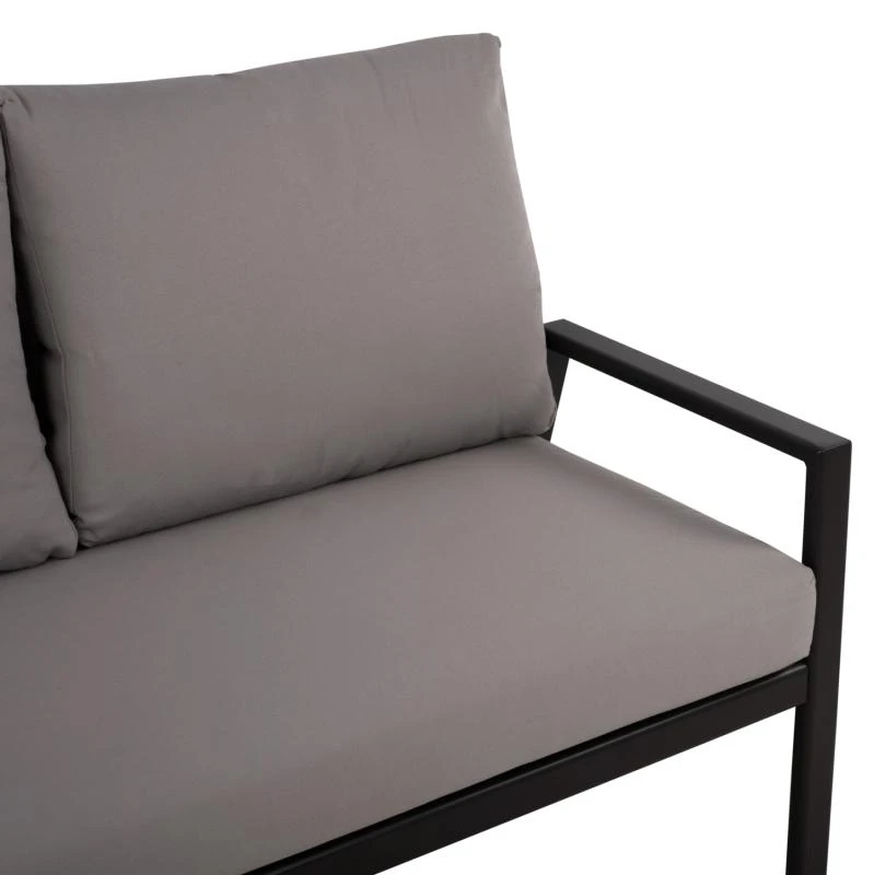 Καναπές διθέσιος με σκελετό αλουμινίου σε ανθρακί απόχρωση επενδυμένο σε κάθισμα και πλάτη από ύφασμα textiline και υφασμάτινα μαξιλάρια σε γκρι χρώμα.