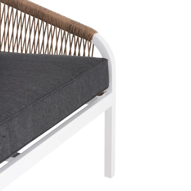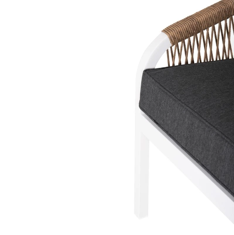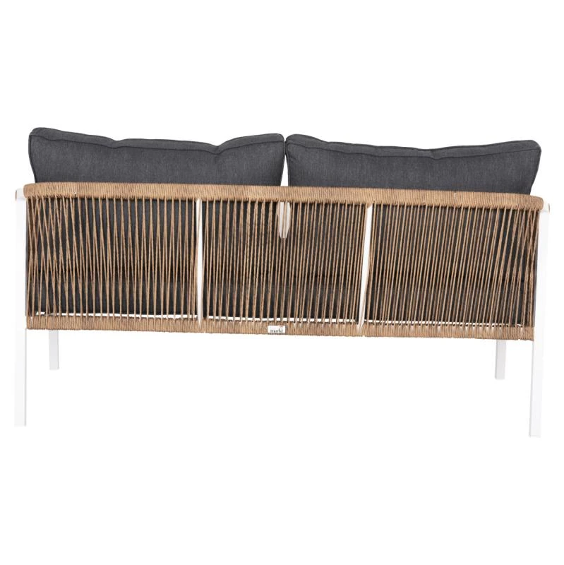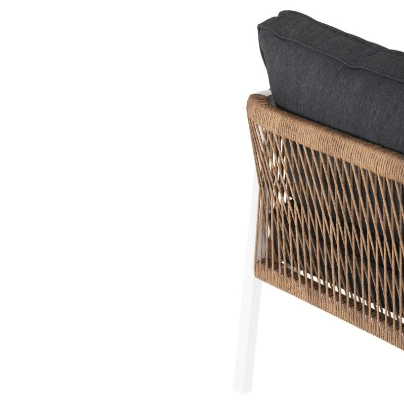Σας παρουσιάζουμε τον MAERLY, έναν πανέμορφο 3θέσιο καναπέ εξωτερικού χώρου σε συνδυασμό ΛΕΥΚΟΥ-ΑΝΘΡΑΚΙ. Ο συνδυασμός του σκελετού αλουμινίου σε ΛΕΥΚΟ χρώμα με το ΣΚΟΥΡΟ ΜΠΕΖ συνθετικό σχοινί που διατρέχει πλεγμένο όλο τον καναπέ, καθώς και τα 2 μεγάλα μαξιλάρια πλάτης με πολυεστερικό ύφασμα σε ΑΝΘΡΑΚΙ χρώμα είναι μοναδικός, και μπορεί να αλλάξει άμεσα την εικόνα οποιουδήποτε εξωτερικού χώρου. Χαρακτηριστικό γνώρισμα αυτού του καναπέ είναι ότι τα πόδια είναι ψηλά, με αποτέλεσμα και το ύψος του καθίσματος να είναι ψηλό.