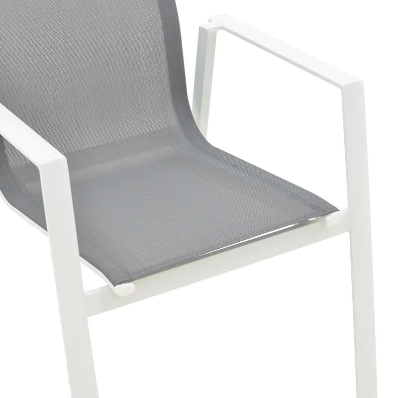 - Σταθερός σκελετός από εξαιρετικής ποιότητας αλουμίνιο με αντοχή στην καταπόνηση και στη φθορά. Κυρίως σώμα καρέκλας από εξαιρετικής ποιότητας textilene. Το textilene είναι ύφασμα μεγάλης αντοχής στην ηλιακή ακτινοβολία και την υγρασία ενώ παράλληλα αφήνει το δέρμα να “αναπνέει” δημιουργώντας έτσι άνεση στο κάθισμα.