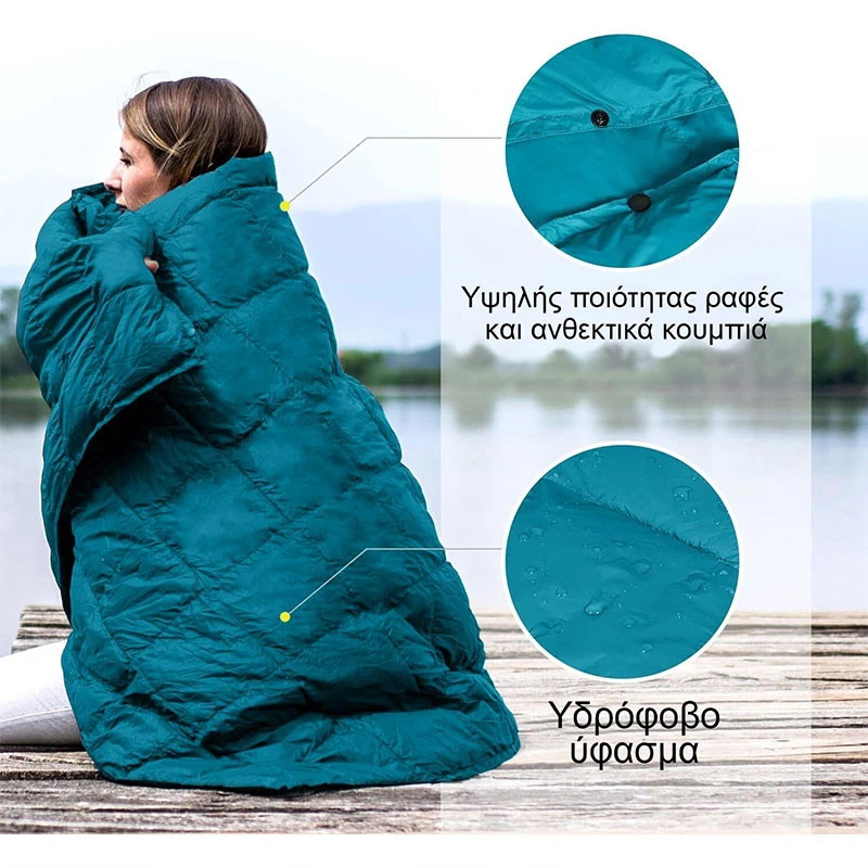 Σκεπαστείτε με αυτό και κοιμηθείτε, χρησιμοποιήστε το σαν υπνόσακο, φορέστε το έτσι ώστε να έχετε τα χέρια σας ελεύθερα ή χρησιμοποιήστε το για να κάτσετε απλά στο έδαφος. Είναι ιδανικό για το κάμπινγκ, για την πεζοπορία, ή μπορείτε να το χρησιμοποιήσετε ως μια ζεστή κουβέρτα έκτακτης ανάγκης που θα έχετε στο αυτοκίνητό σας. Τοποθετημένο στην θήκη του μπορεί να χρησιμοποιηθεί και ως μαξιλάρι. Μαλακό, αφράτο και με μια μεταξένια αίσθηση στο δέρμα, είναι κατάλληλο για θερμοκρασίες από 0-20°C. Τυλίγεται γύρω από ολόκληρο το σώμα, η γέμιση από 100% πολυεστέρα εξασφαλίζει ζεστασιά, ενώ είναι ανθεκτικό στην βρομιά και την φθορά.